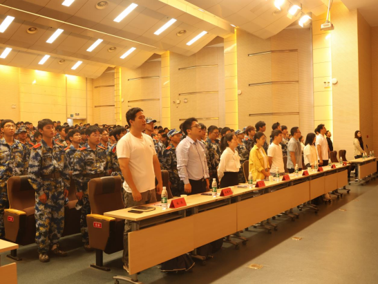 全体师生起立,目光庄重。激昂的国歌旋律缓缓流淌,师生们齐声高唱,歌声在会场回荡,为整场典礼拉开庄严而热烈的序幕。